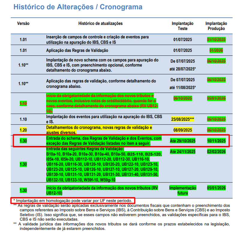 - Ambiente de homologação da NF-e: o último cronograma divulgado indica que até 29/10/2025, as UFs implementarão os novos campos. Em algumas UFs já está sendo possível emitir notas em ambiente de homologação com os novos impostos. Ou seja, o ajuste dos schemas depende de cada UF.