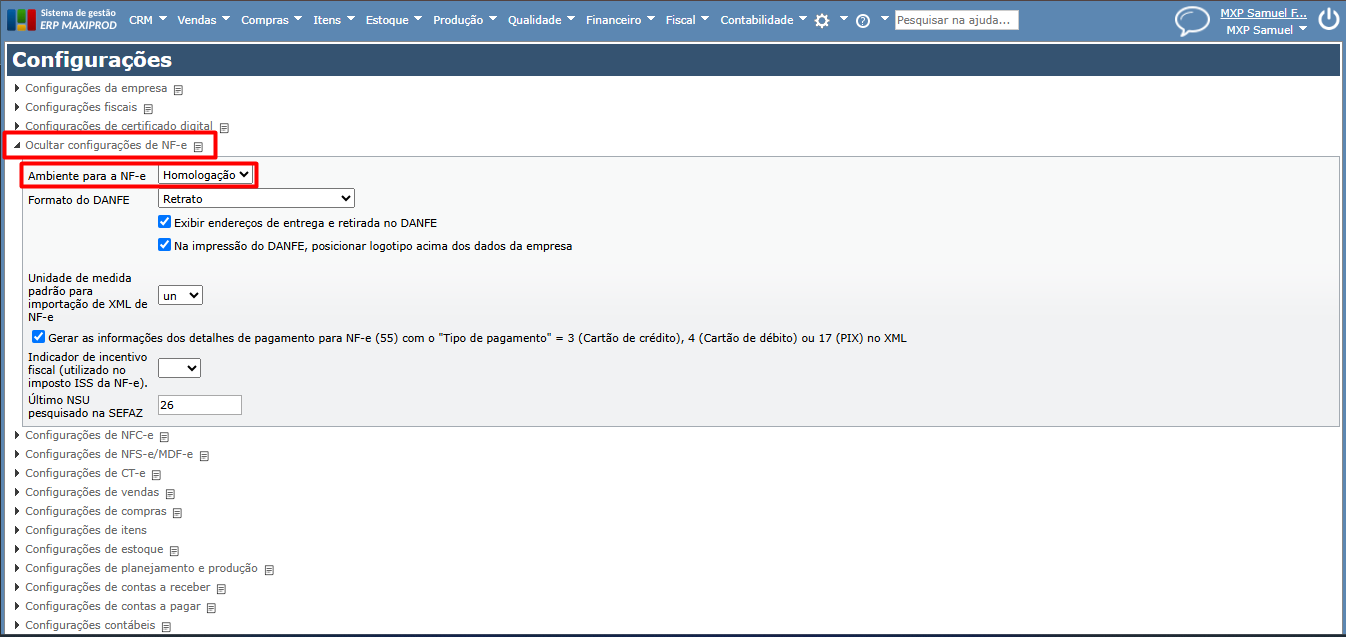 a) Atenção: se o ambiente para emissão de NF-e for alterado para “Homologação” nas configurações da sua empresa no sistema, todas as notas emitidas no período não terão validade fiscal e jurídica.