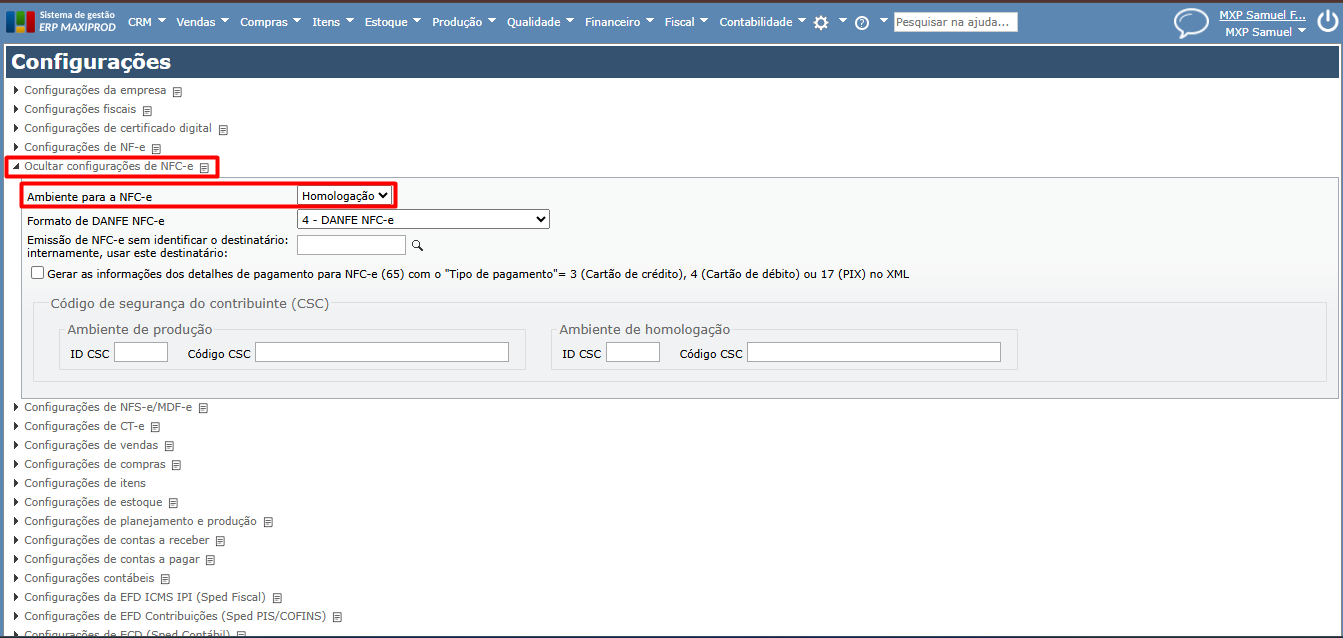 c) Para alterar o ambiente para a NFC-e, acesse o menu superior “Roda dentada > Configurações > Configurações de NFC-e” e ajuste o campo “Ambiente para a NFC-e”. Lembre de clicar “Salvar” no rodapé da tela de configurações.