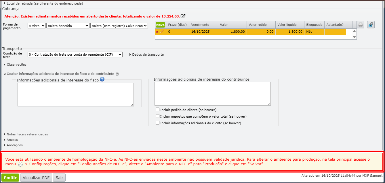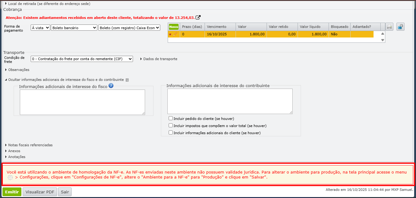 3) Se o ambiente para a NF-e ou NFC-e estiver configurado como “Homologação”, o sistema exibe o seguinte aviso no rodapé da tela de edição das notas fiscais que tiverem o campo “Documento fiscal” igual a “55 – NF-e” ou “65 – NFC-e”.