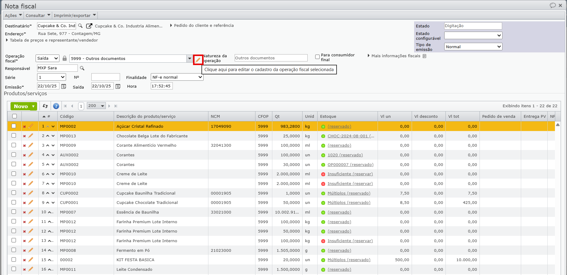 a) Pode-se também editar a operação fiscal selecionada pela tela de edição do documento de venda ou compra, através do ícone do lápis ao lado do campo “Operação fiscal”,
