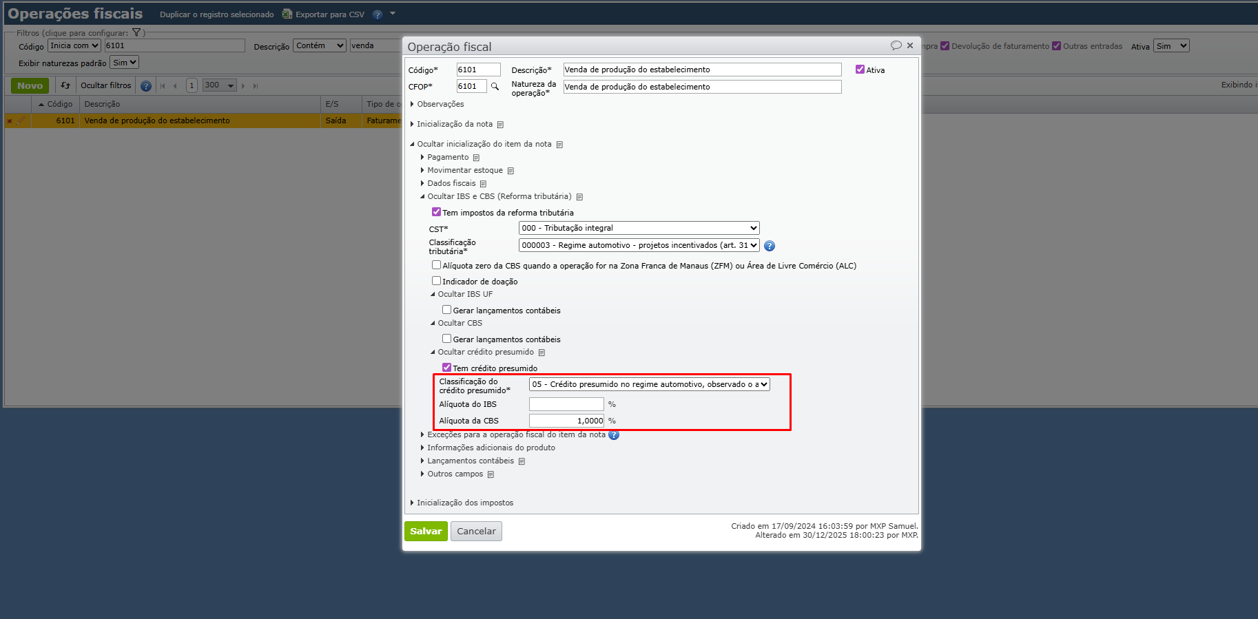 2) Preencha o campo “Classificação do crédito presumido” e as alíquotas do IBS/CBS aplicáveis, depois, clique em “Salvar”.
