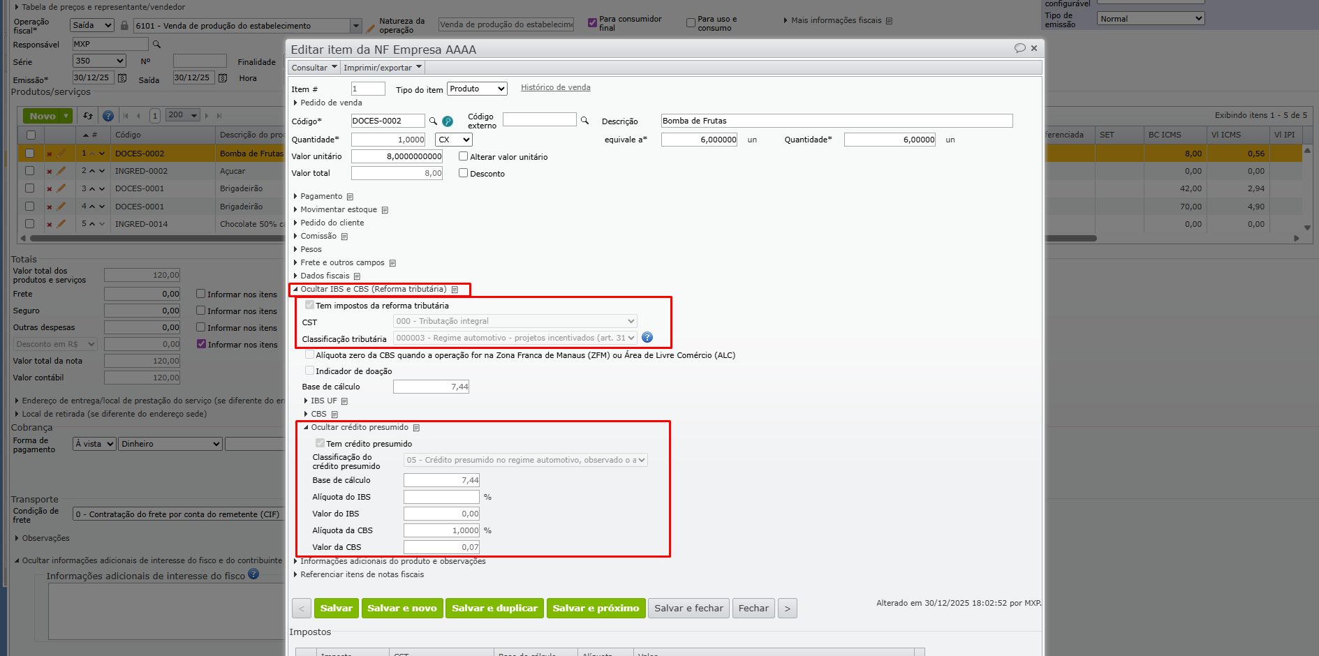 3) As informações ficam visíveis na nota, ao editar os itens, na seção “IBS e CBS (Reforma tributária)” e também são levadas ao XML no grupo <gCredPresOper>.