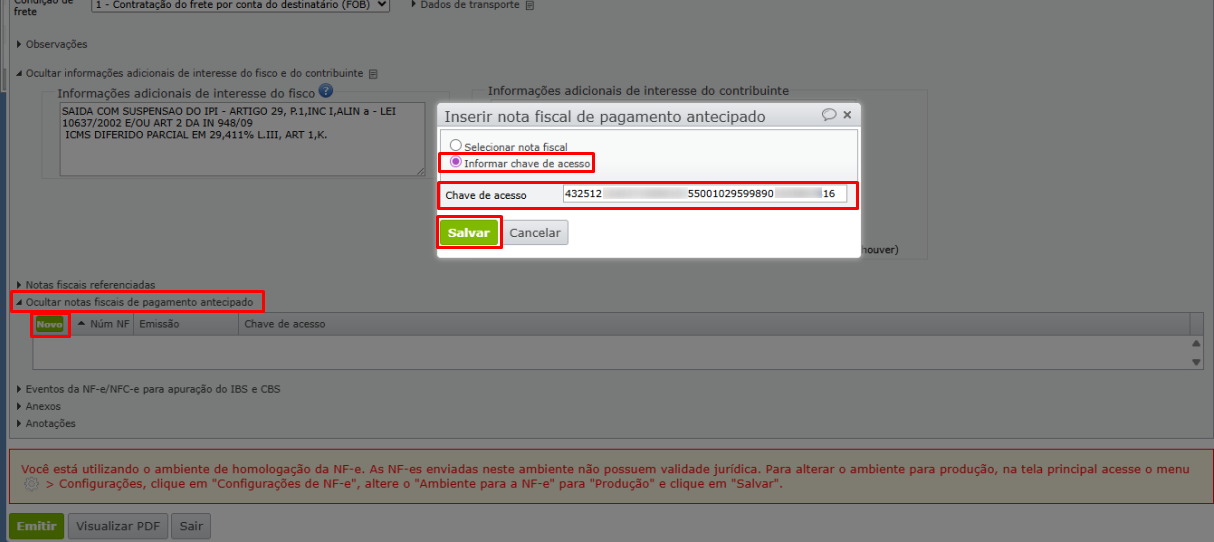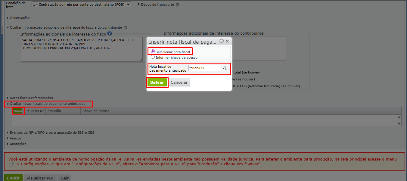 3) Após informar a nota de pagamento antecipado e clicar em “Salvar”, preencha os demais dados da NF-e e finalize a emissão.
