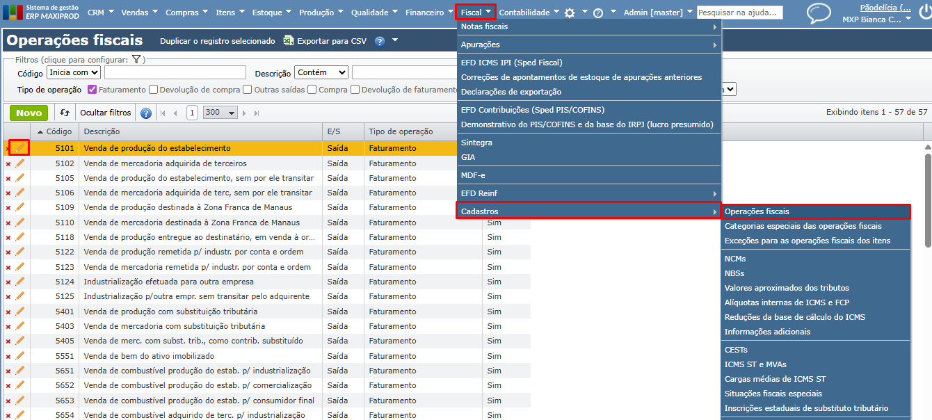 2) Selecione a operação fiscal, clique no ícone lápis para editar, ou duplique a operação para fazer alterações.