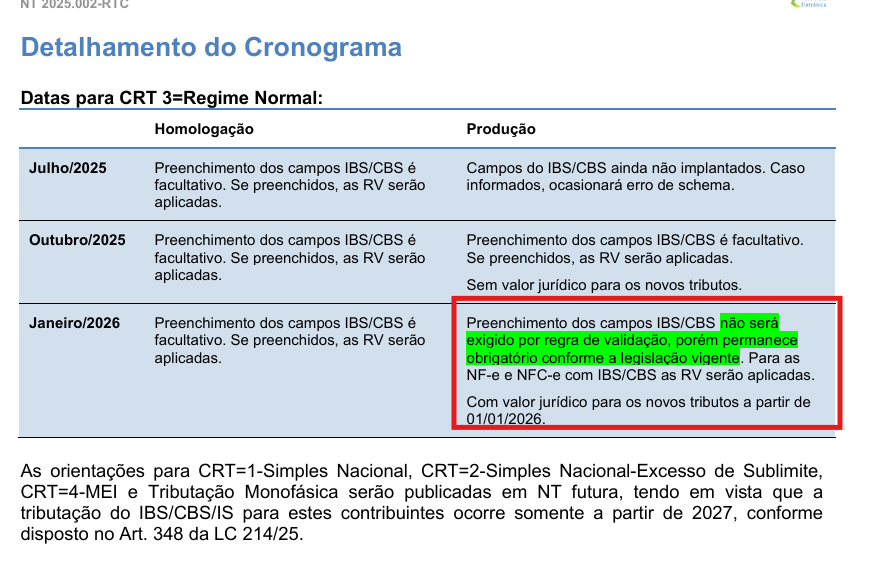 Vide abaixo o cronograma divulgado pelo Fisco para a utilização dos novos campos, conforme Nota Técnica 2025.002 – v1.33.
