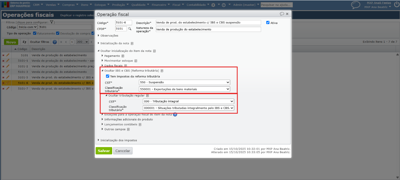 ⚠️ Importante: a definição da CST e da classificação tributária para IBS UF e CBS é de responsabilidade da empresa, em conjunto com sua contabilidade. É recomendável fazer o levantamento das operações e tributações para 2026, garantindo que os documentos fiscais sejam preenchidos corretamente, tanto na edição da operação fiscal, quanto na emissão da nota fiscal.