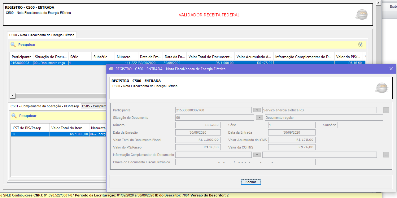 Realizado recebimento do documento e feitas as devidas apurações do PIS e do COFINS, a aquisição de energia elétrica será destacada no registro C500 dos documentos fiscais de entrada da EFD gerada.