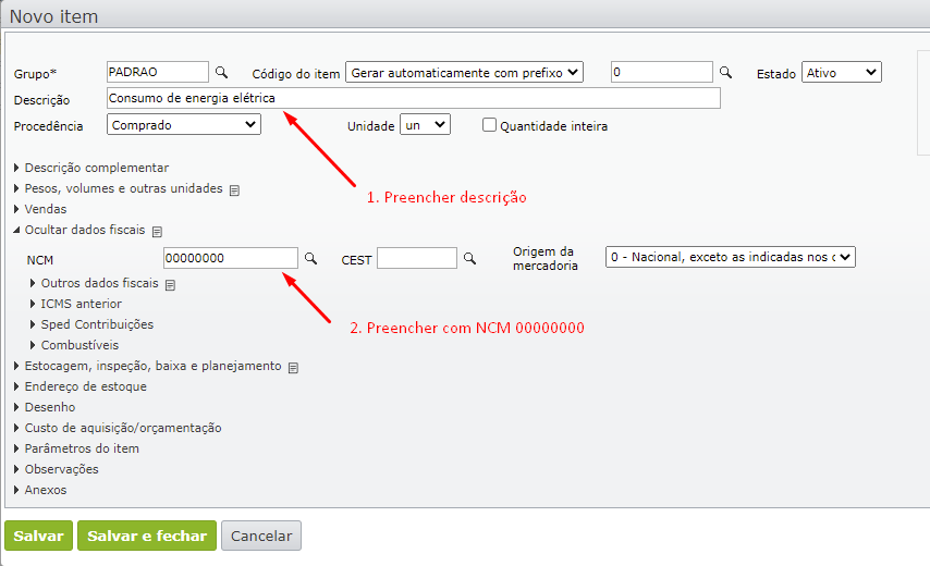 1.2) “NCM” (do menu “Dados fiscais”), que deve ser preenchido com o NCM de código 00000000 para casos variados.