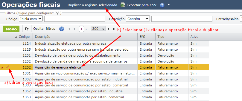 para editar a operação fiscal desejada (a). Se este ícone de edição não aparecer, pode-se selecionar a operação fiscal e duplicá-la (b), criando uma operação fiscal com novas configurações. Há também a opção de utilizar um plano de contas próprio, em que todas as contas contábeis e operações fiscais são alteráveis na assinatura; para esta configuração, acesse aqui nossa página de ajuda sobre plano de contas.