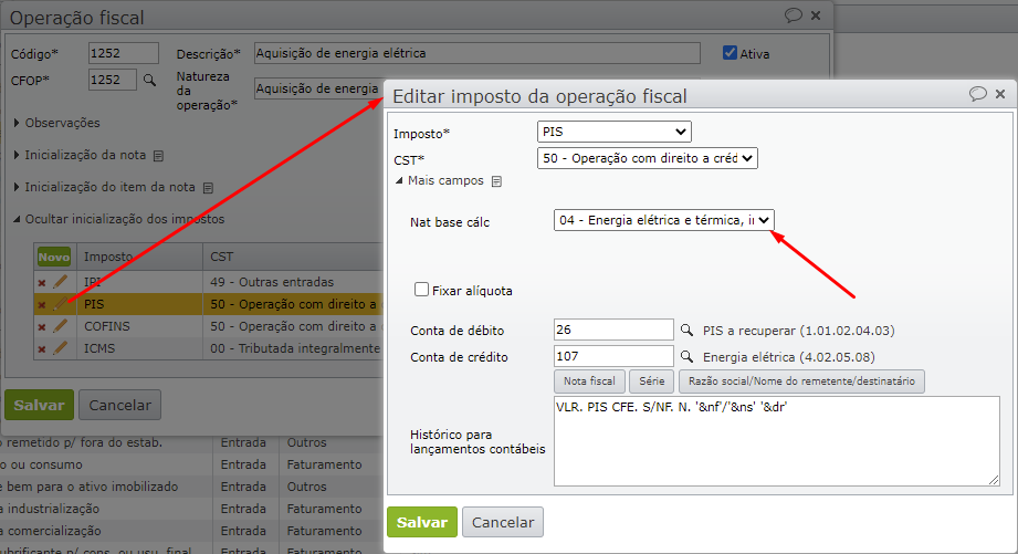 2.2) Além das inicializações essenciais para a nota fiscal, deve ser configurada a “Inicialização dos impostos”. Destaque para o preenchimento da “Natureza da base de cálculo” no imposto PIS, a ser preenchido com a opção “04 – Energia elétrica e térmica, inclusive sob a forma de vapor”. Além disso, preencha aqui também a conta contábil referente à operação no campo “Conta de crédito” da aba “Mais campos” da edição de cada imposto. No caso de exemplo, foi preenchido com a conta padrão 107 – “Energia elétrica”.