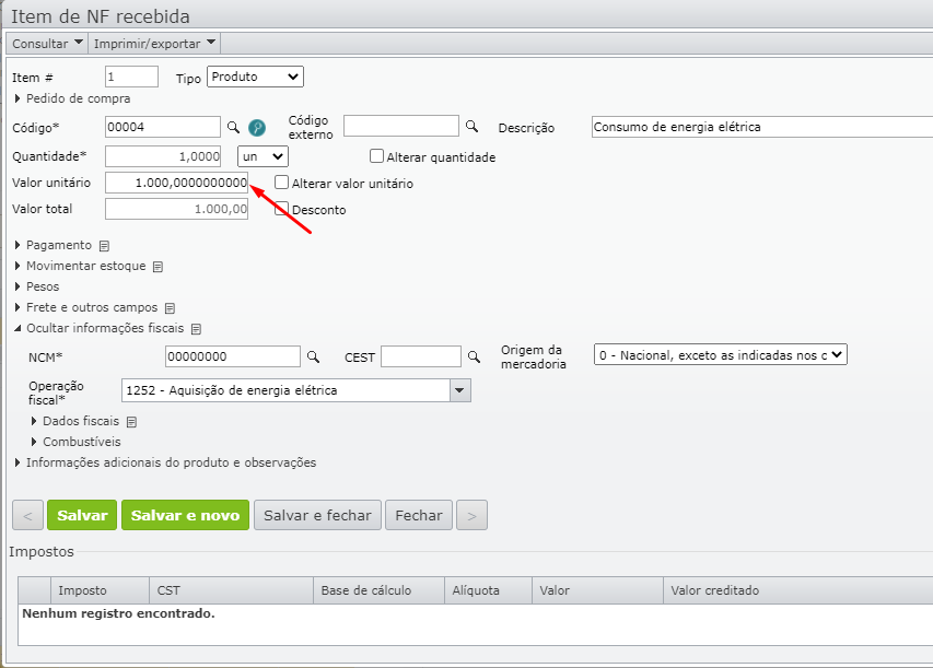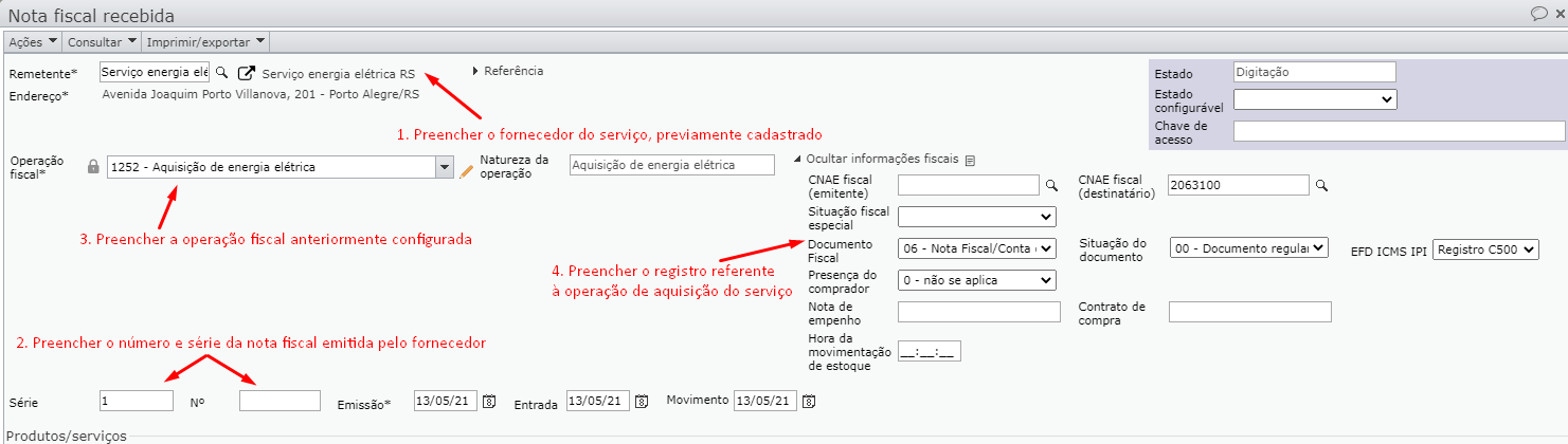 O preenchimento do item 3.4 acima será feito automaticamente caso o passo 2 referente à configuração da operação fiscal tenha sido feito completamente conforme orientado. De qualquer forma, é um preenchimento necessário para a devida emissão deste documento da aquisição de energia elétrica/água/gás.