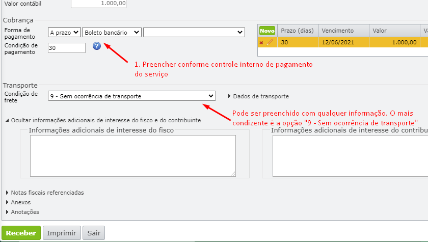 3.6) Por fim, basta preencher a “Forma de pagamento” conforme o controle do pagamento do serviço. O campo “Condição de frete” pode ser preenchido com qualquer informação.