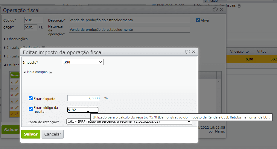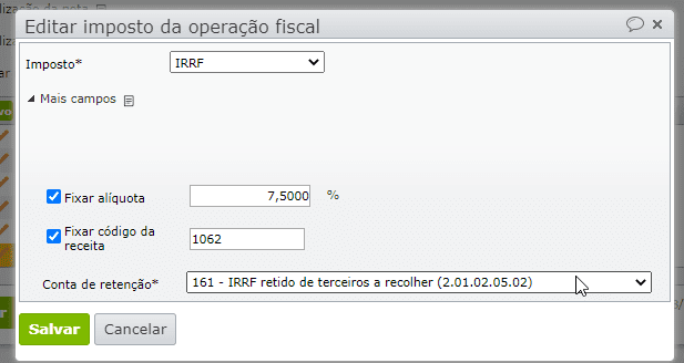 5) Em “inicialização dos impostos”, adicione o imposto incidente sobre a operação (IRRF ou CSLL ret):