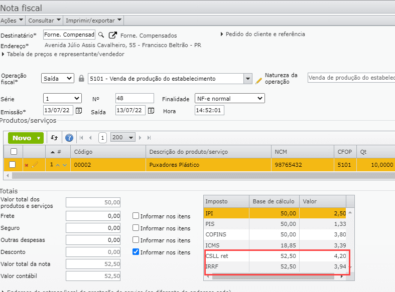 7) Agora, pode ser emitida a NF com valores retidos de impostos:
