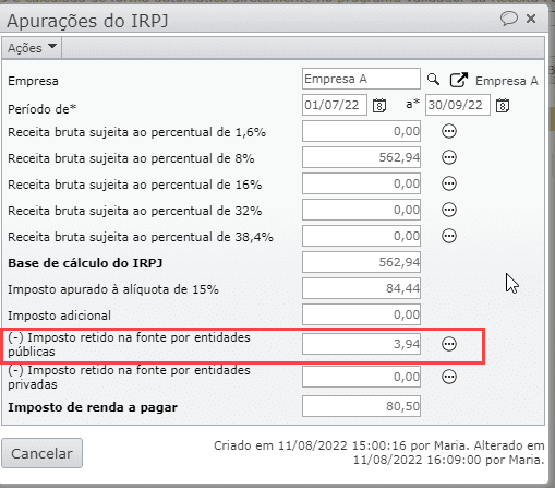 8) Na geração da apuração de IRPJ e CSLL, são calculados os valores retidos pelas operações, preenchendo o campo (-) Imposto retido na fonte por entidades públicas e/ou (-) Imposto retido na fonte por entidades privadas: