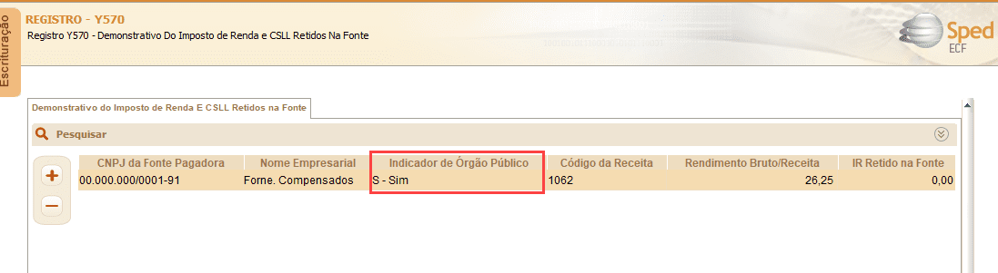 Este registro contém as informações referentes a documentos com os impostos IRPJ e CSLL retidos na fonte, durante o período coberto pela ECF.