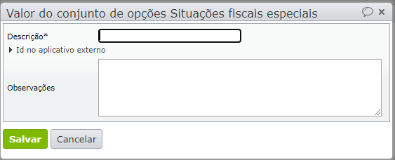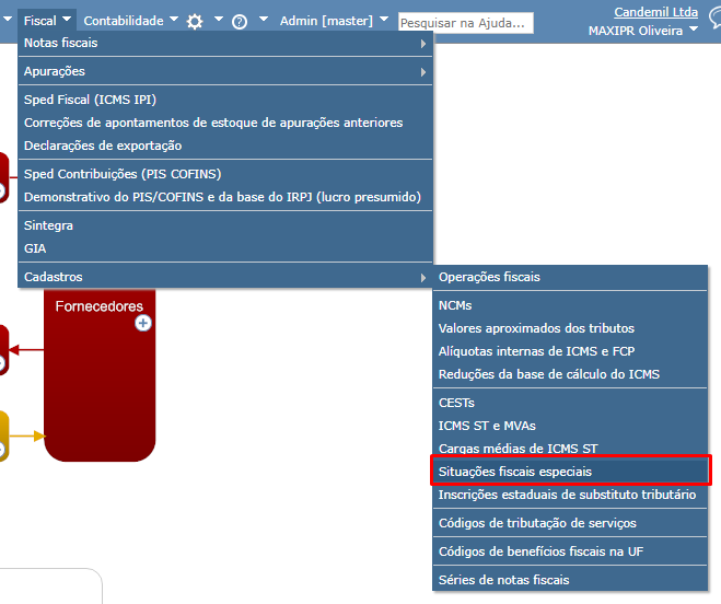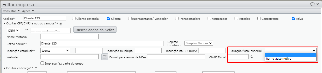 3) No campo Situação fiscal especial, selecione uma situação já cadastrada.