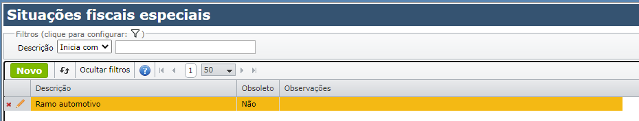 3) Preencha o campo Descrição com o nome da situação fiscal especial, por exemplo, Ramo automotivo. A grade de Situações fiscais especiais incluirá a situação cadastrada, como mostra a imagem: