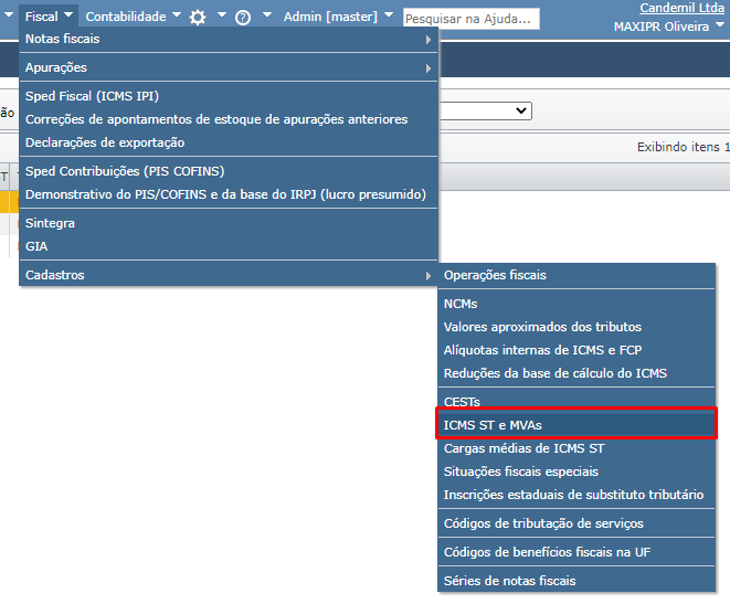 1) Vá ao menu “Fiscal” > “Cadastros” > “ICMS ST e MVAs”.