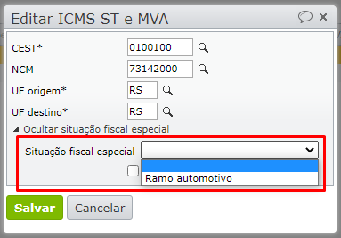 2) Na tela de edição da MVA, selecione a “Situação fiscal especial”.