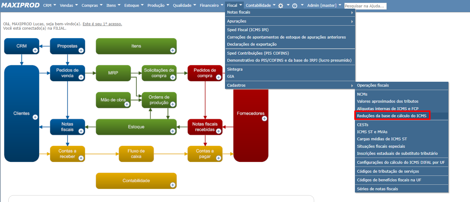 1) Vá ao menu “Fiscal” > “Cadastros” > “Reduções da base de cálculo do ICMS”.