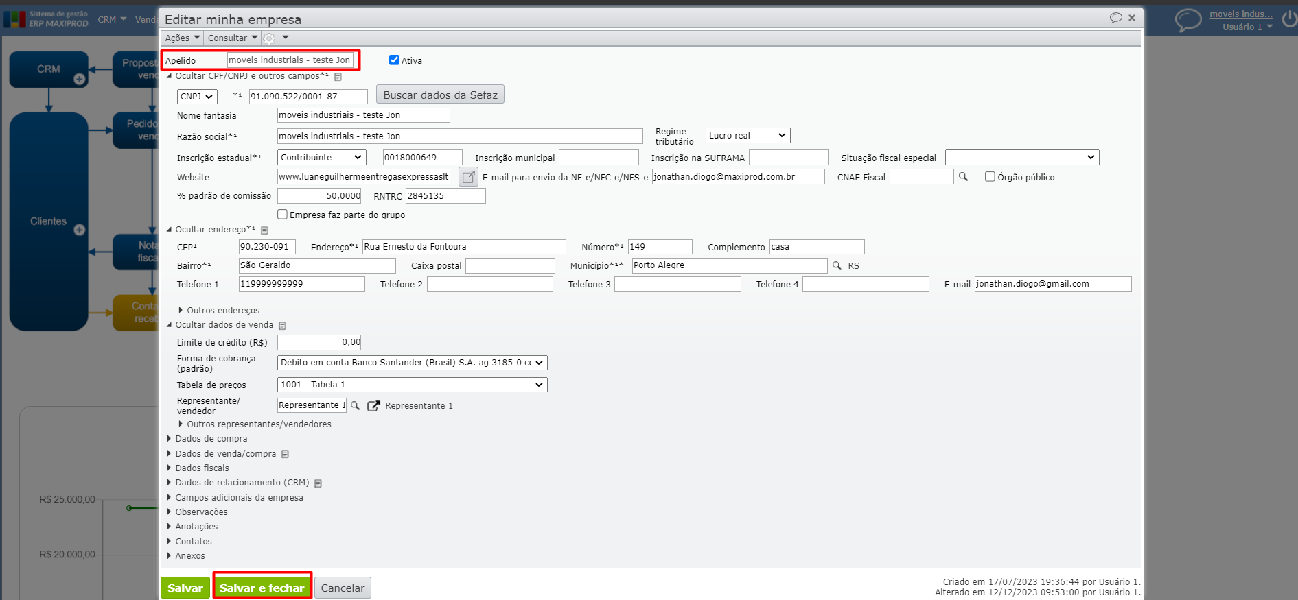 c) Clique no botão verde “Salvar e fechar” e repita o processo de alteração do apelido da própria empresa.