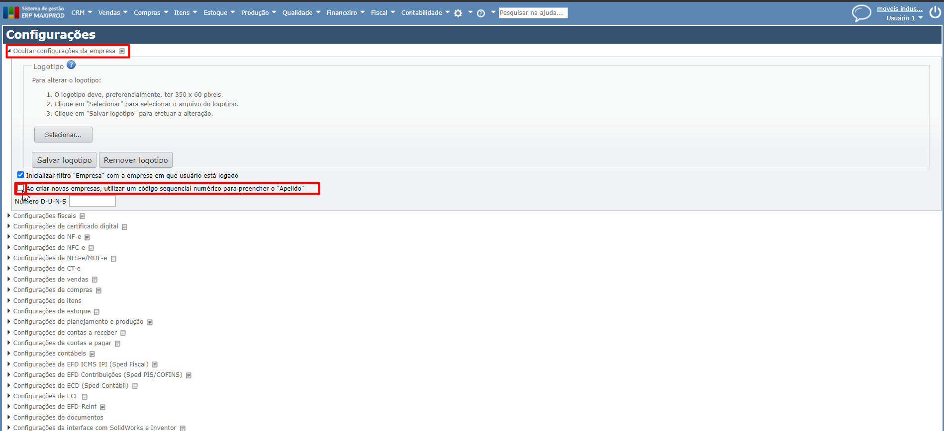 3) Se não for possível alterar o campo “Apelido”, provavelmente a opção “Ao criar novas empresas, utilizar um código sequencial numérico para preencher o “Apelido”.” está marcada nas configurações da empresa. Para alterar esta opção: