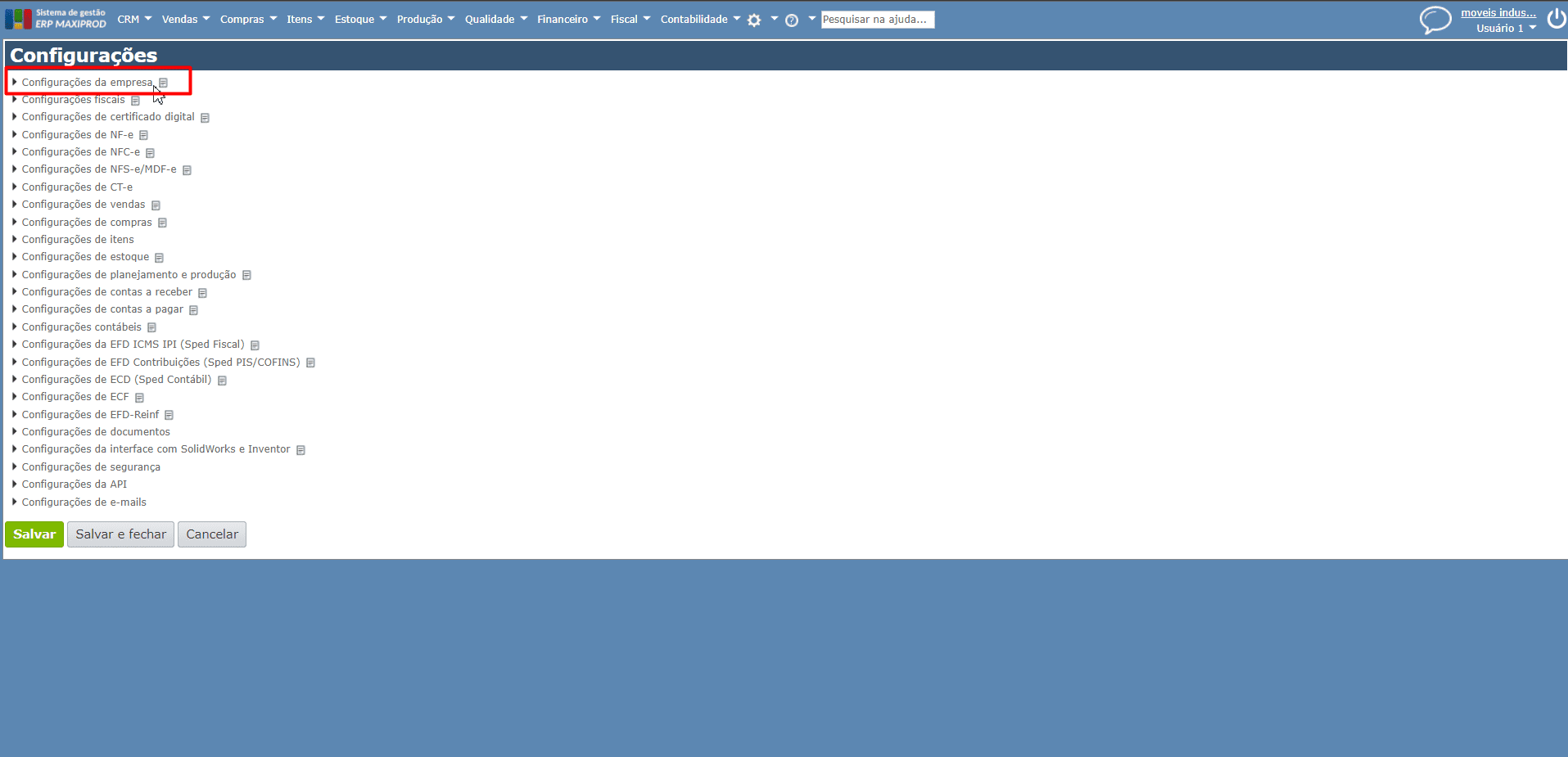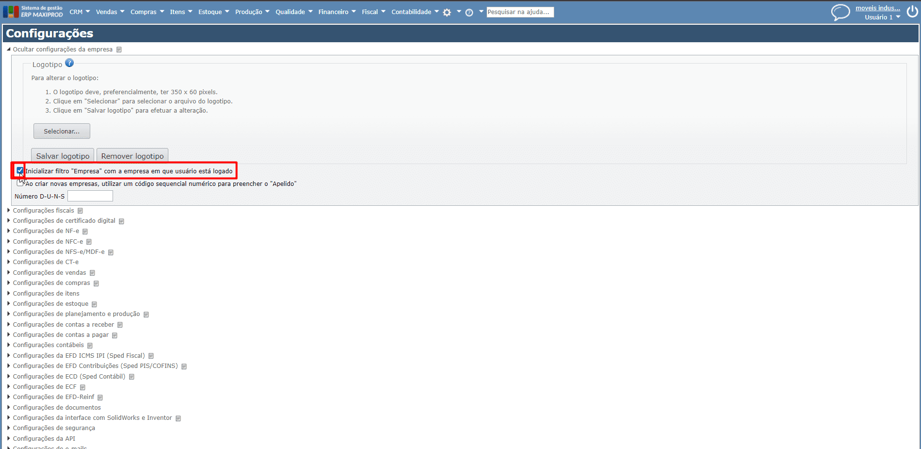 No ERP MAXIPROD, pode-se configurar a inicialização do filtro “Empresa” das telas pertinentes, preenchendo automaticamente o filtro com a empresa na qual o usuário está logado. Isto é particularmente útil para usuários que desejam visualizar apenas os registros da empresa na qual estão logados, sem incluir os registros relativos às demais empresas da assinatura.