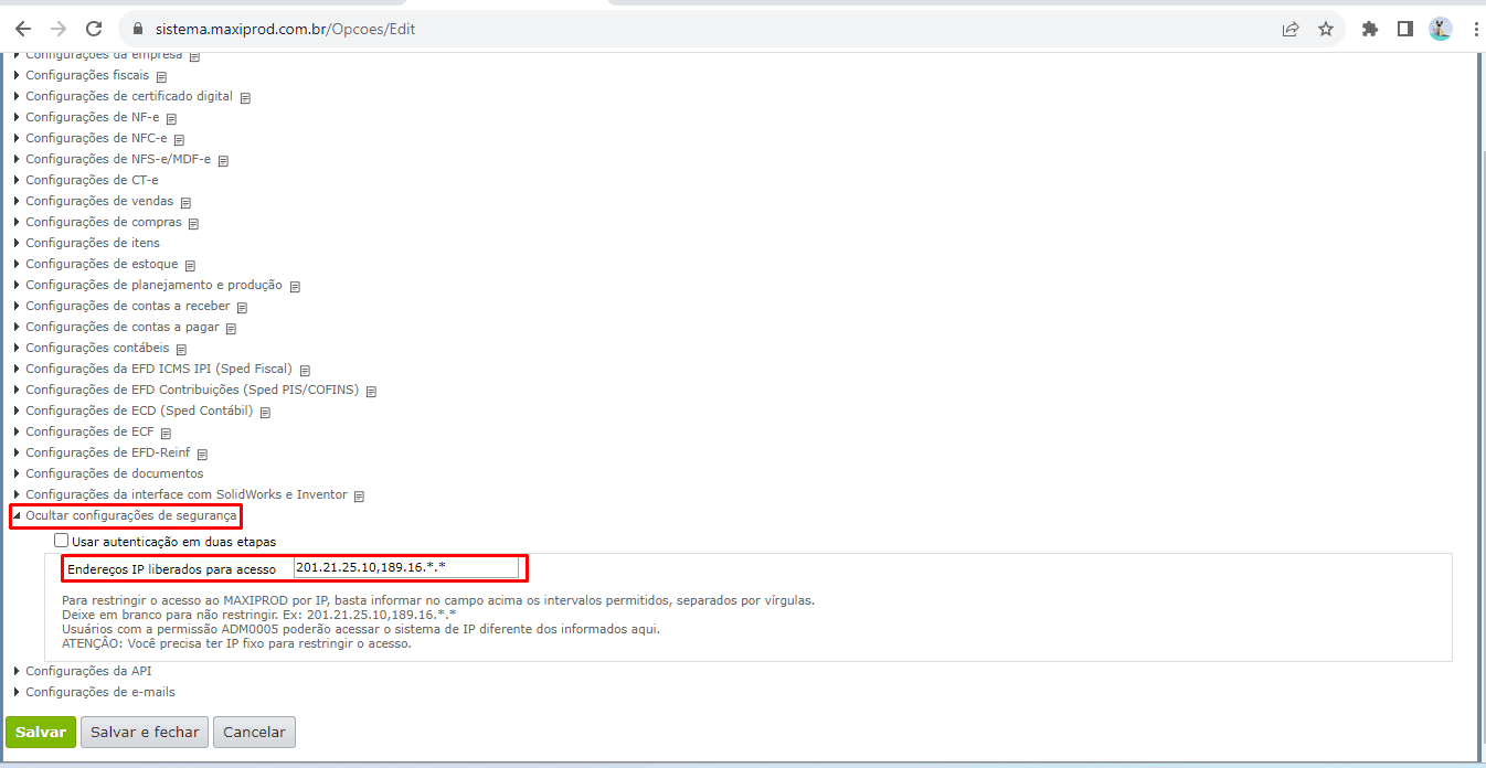 3) Para não restringir, basta deixar o campo “Endereços IP liberados para acesso” em branco, assim como é inicializado, por padrão, ao contratar o ERP MAXIPROD.