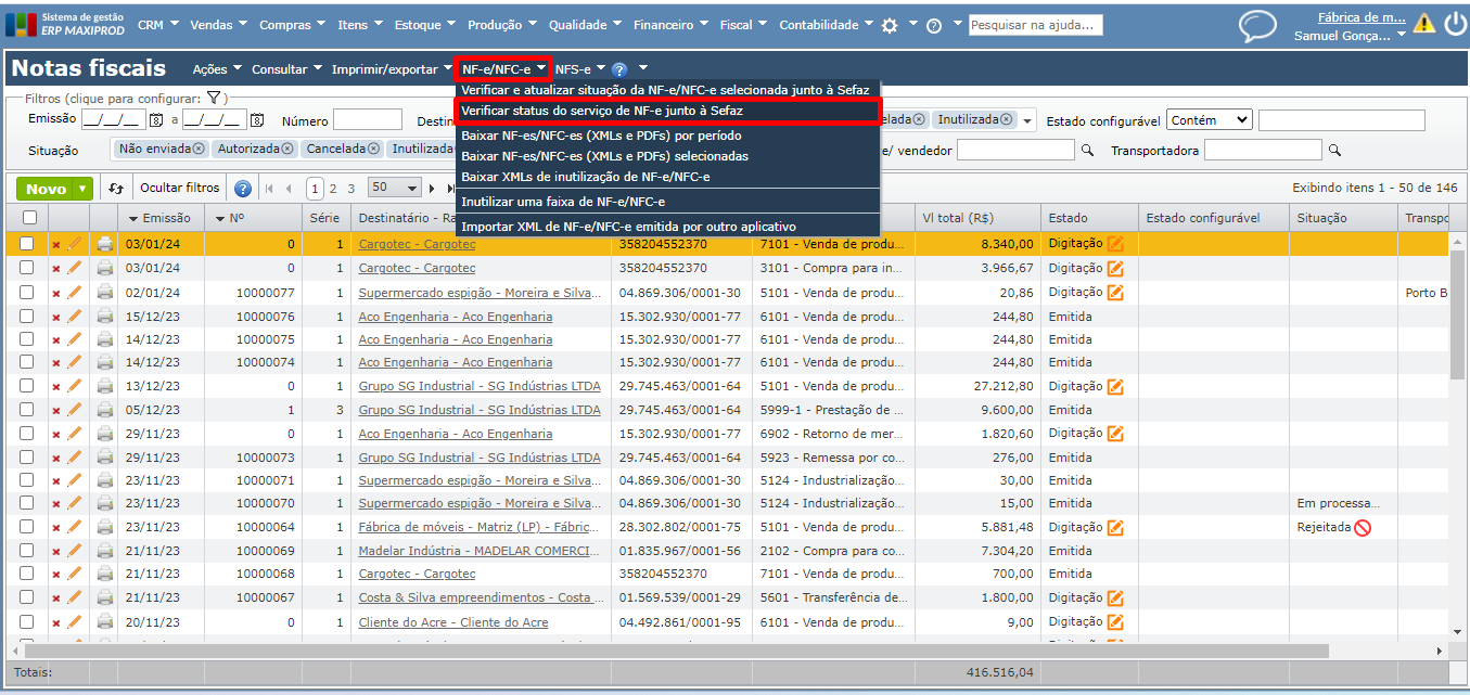 2) Na grade de notas fiscais, acesse o submenu “NF-e/NFC-e > Verificar status do serviço de NF-e junto à Sefaz”.