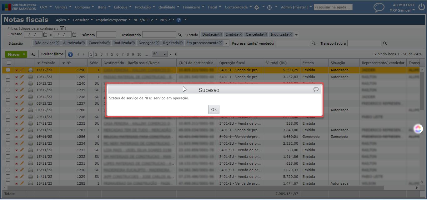 4) Por fim, é exibida uma mensagem com o status do serviço de NF-e.