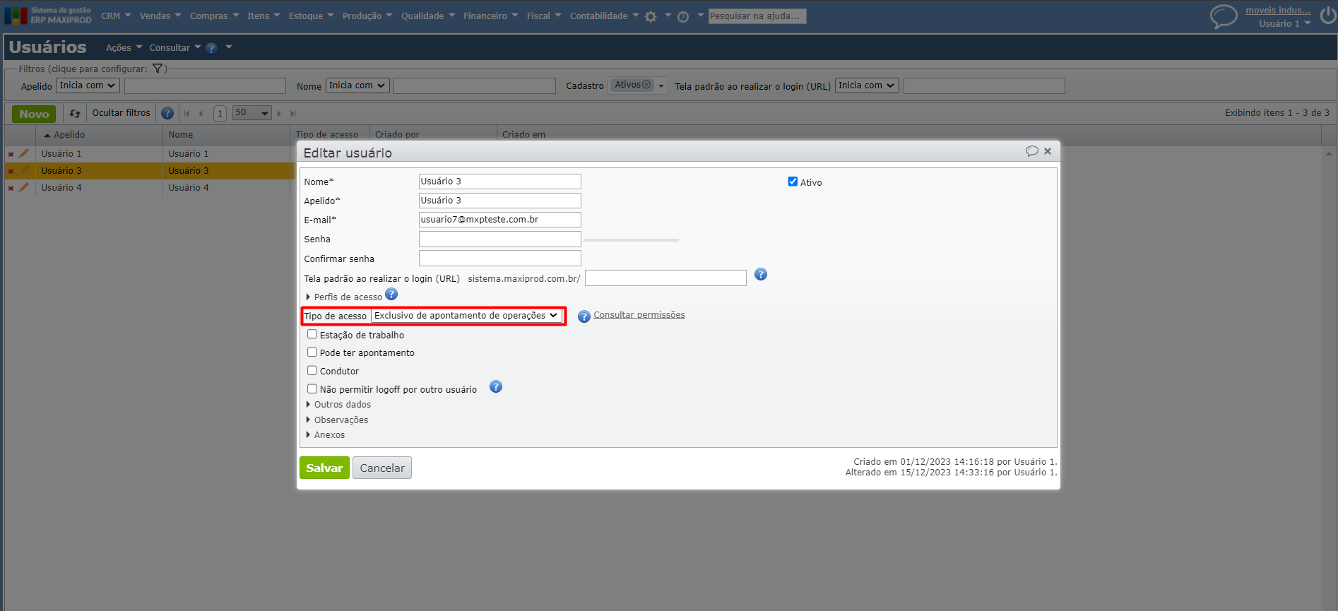 1) Na edição do usuário, modifique o campo “Tipo de acesso” para “Exclusivo de apontamento de operações“.