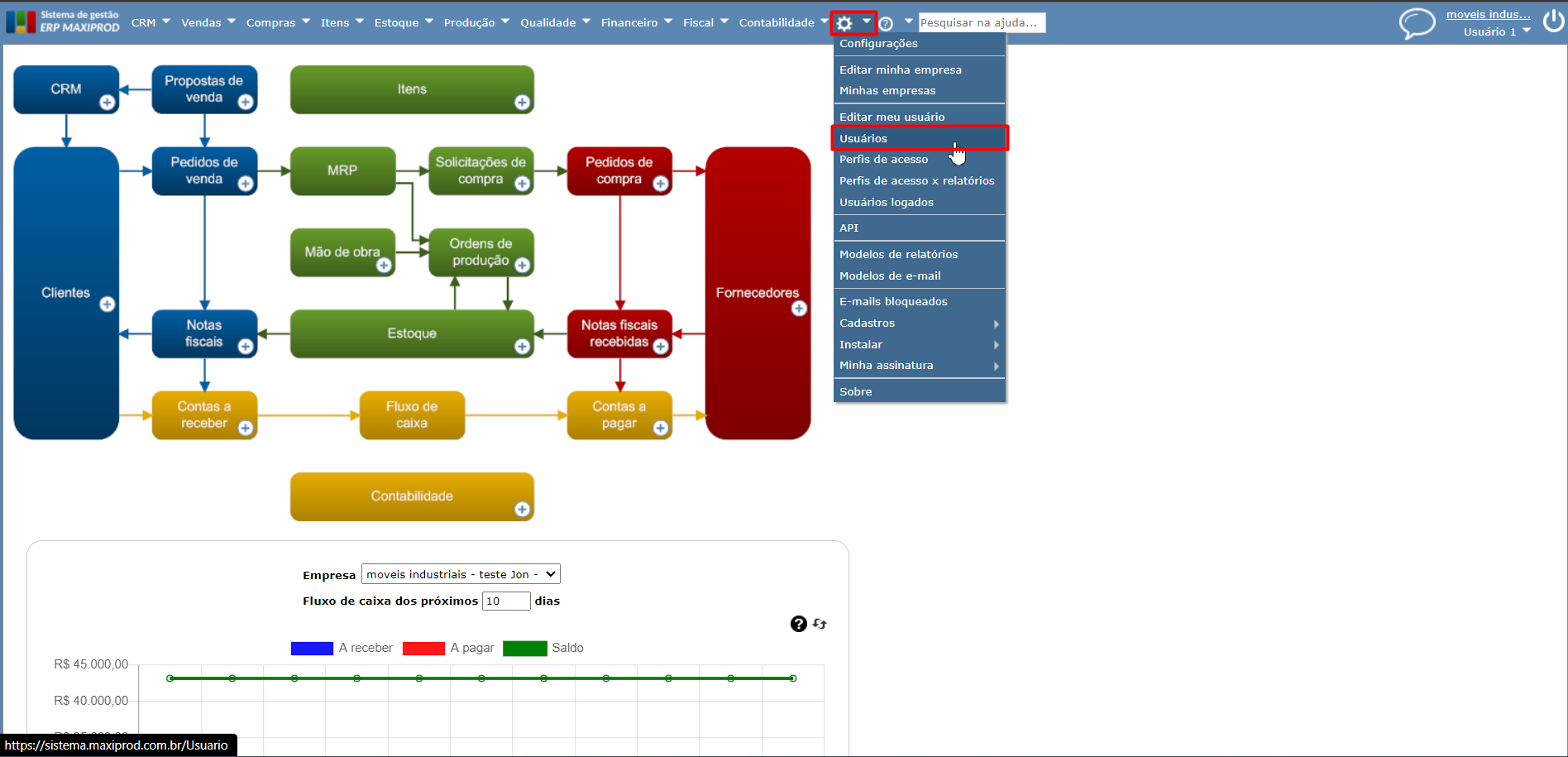 1) Para inativar o usuário acesse o menu “Roda dentada > Usuários”.
