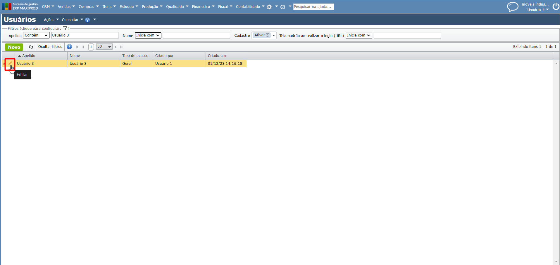2) Identifique o usuário em questão e clique no ícone “lápis laranja” para abrir sua edição.