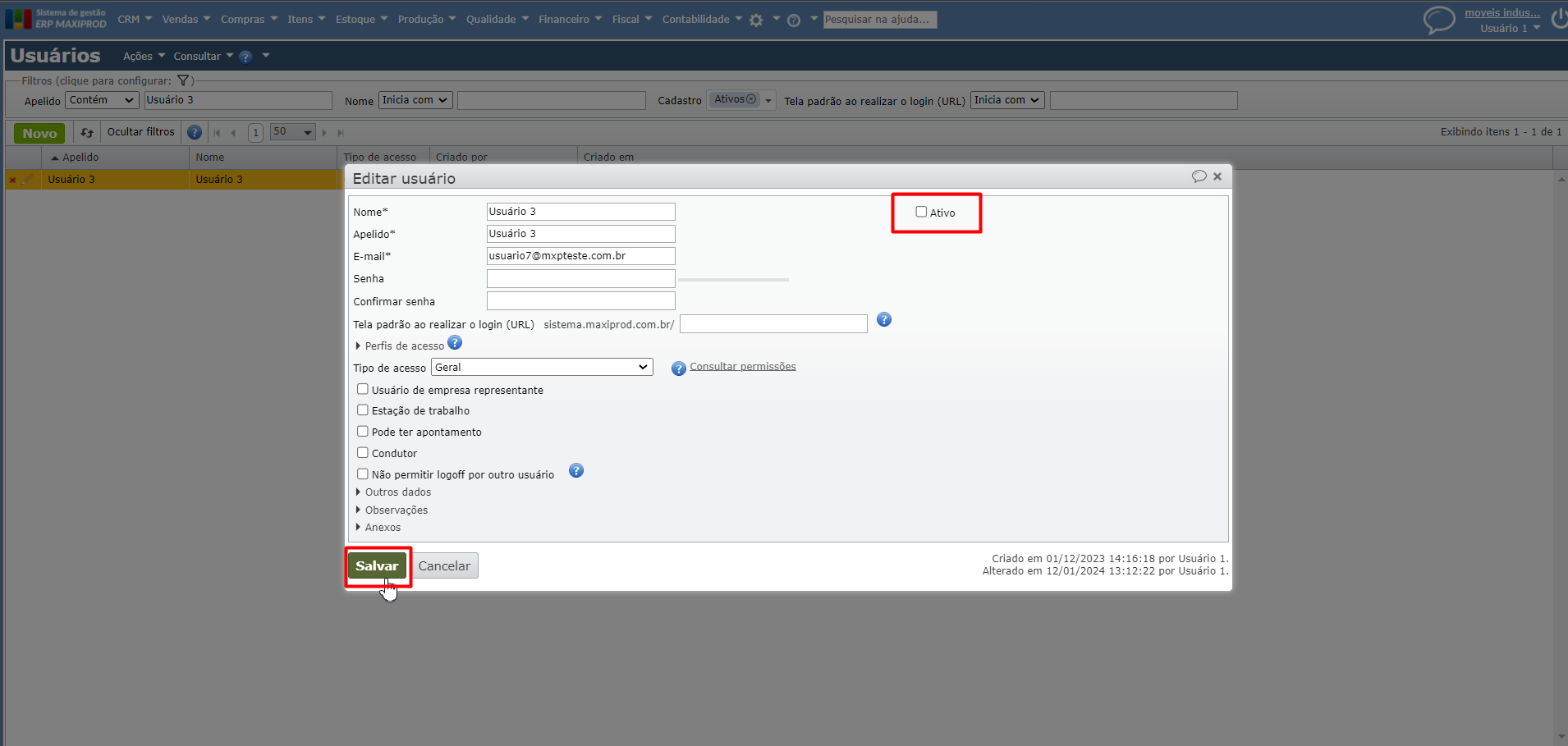 Se o usuário não for mais utilizar o sistema, é aconselhável proceder com a inativação desse usuário. A inativação refere-se à condição em que o usuário, que anteriormente estava ativo e disponível para uso, é desativado, tornando-se indisponível para uso.