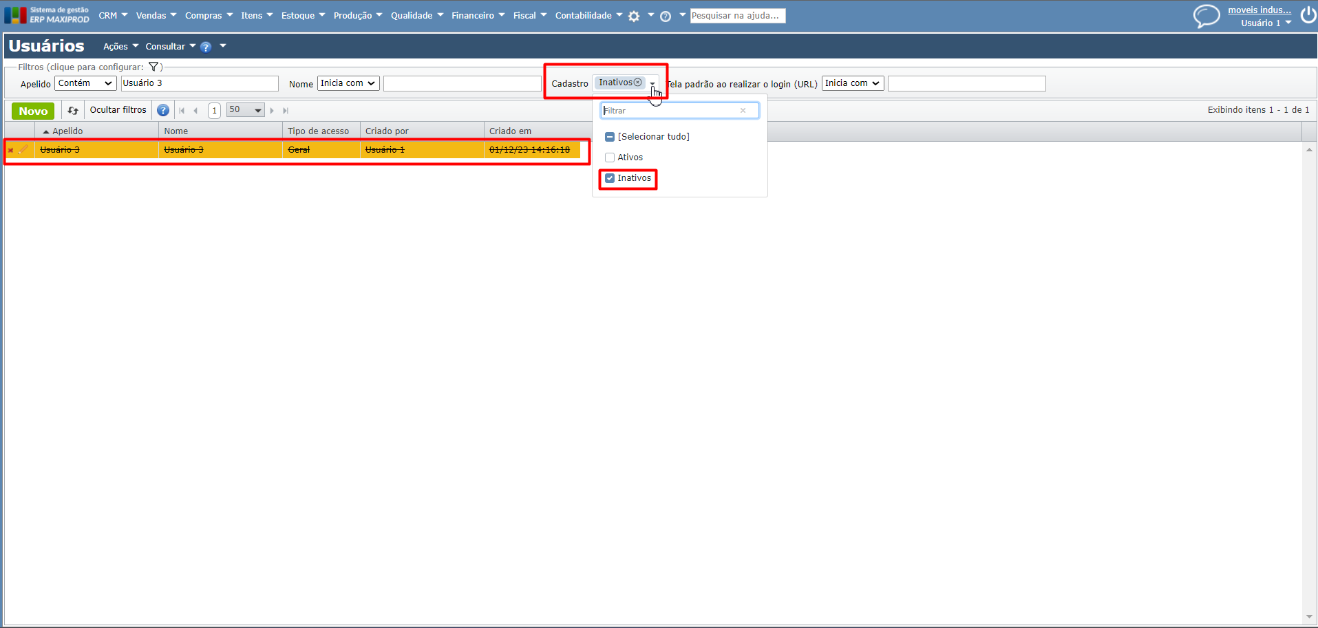 4) Feito isso, o usuário em questão estará inativo e poderá ser visualizado na tela selecionando o filtro “Inativos” em “Cadastro”.