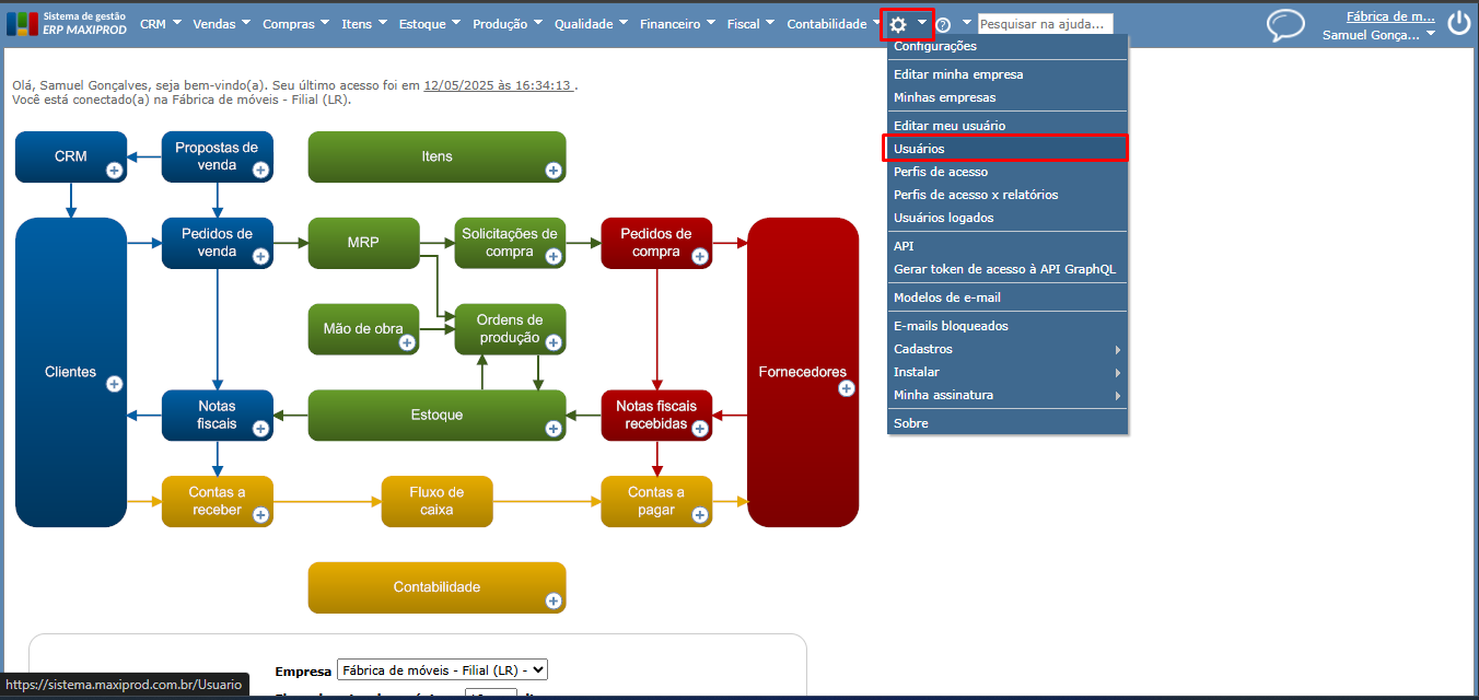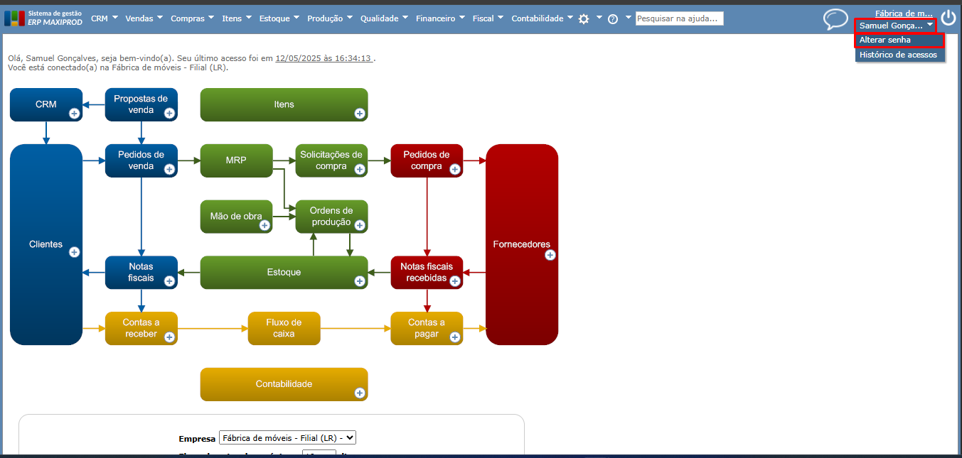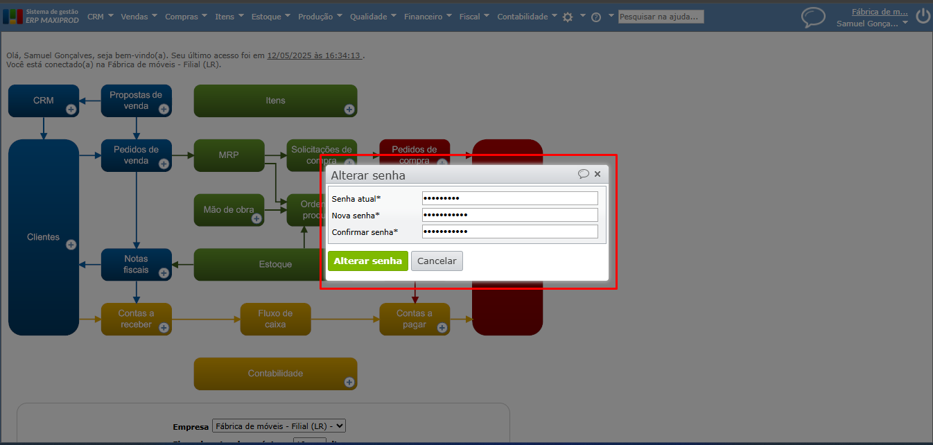 1) No ERP MAXIPROD, posicione o cursor no canto superior direito, onde está seu nome, e clique na opção “Alterar senha”.
