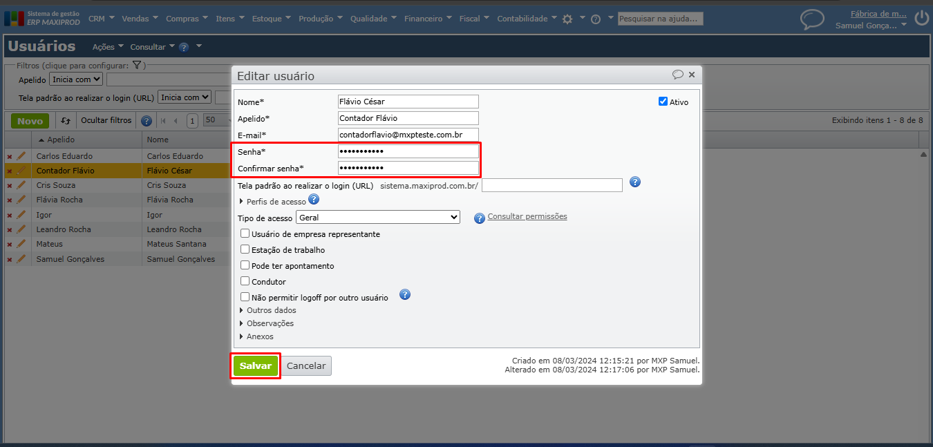 3) Na janela de edição do usuário, no campo “Senha” informe a nova senha, e no campo “Confirmar senha” preencha novamente a nova senha. Clique no botão verde “Salvar” para efetivar a operação.