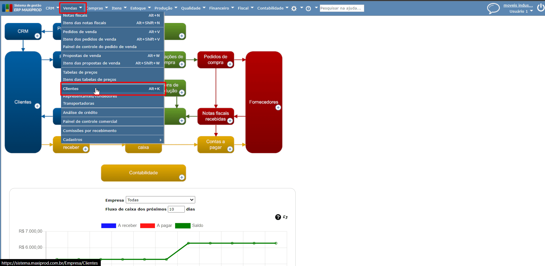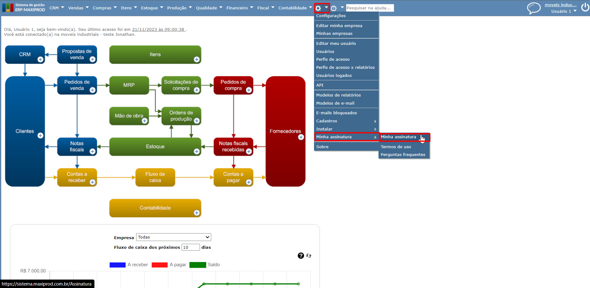 7) A seguir, retorne para a página inicial do sistema clicando em “Sistema de gestão ERP MAXIPROD” e, no canto superior direito, o nome da empresa se tornará um botão clicável.