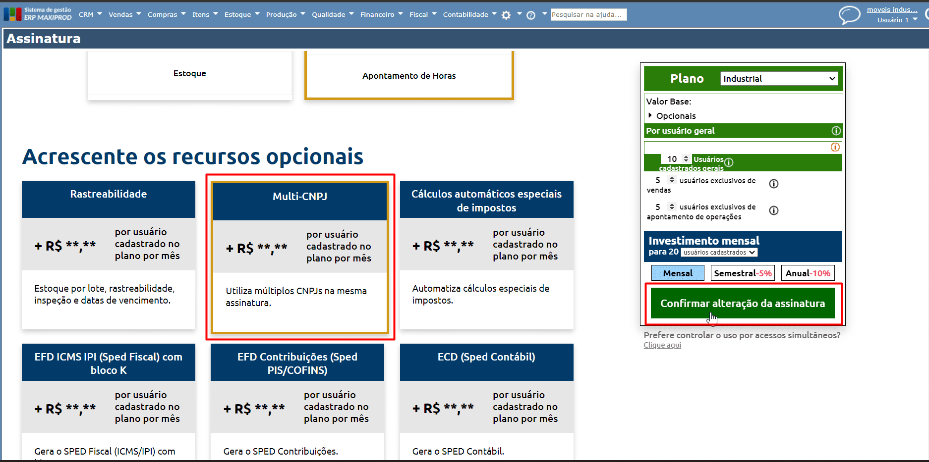Observação: os valores dos recursos adicionais, o cálculo do “Investimento mensal/semestral/anual” e outros valores são visíveis na tela do sistema, mas foram deliberadamente ocultados nesta demonstração, pois alguns dos valores, como “Valor base”, “Investimento mensal/semestral/anual”, etc., podem variar conforme a assinatura contratada.