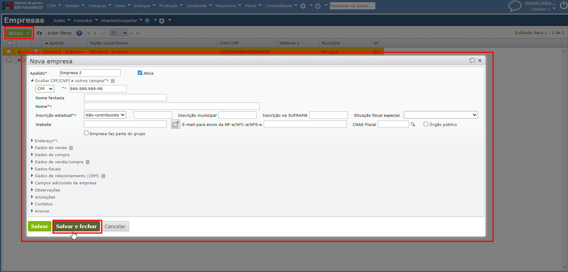 2) Na tela, clique no botão verde “Novo“, insira os dados da nova empresa e clique no botão verde “Salvar e fechar“.
