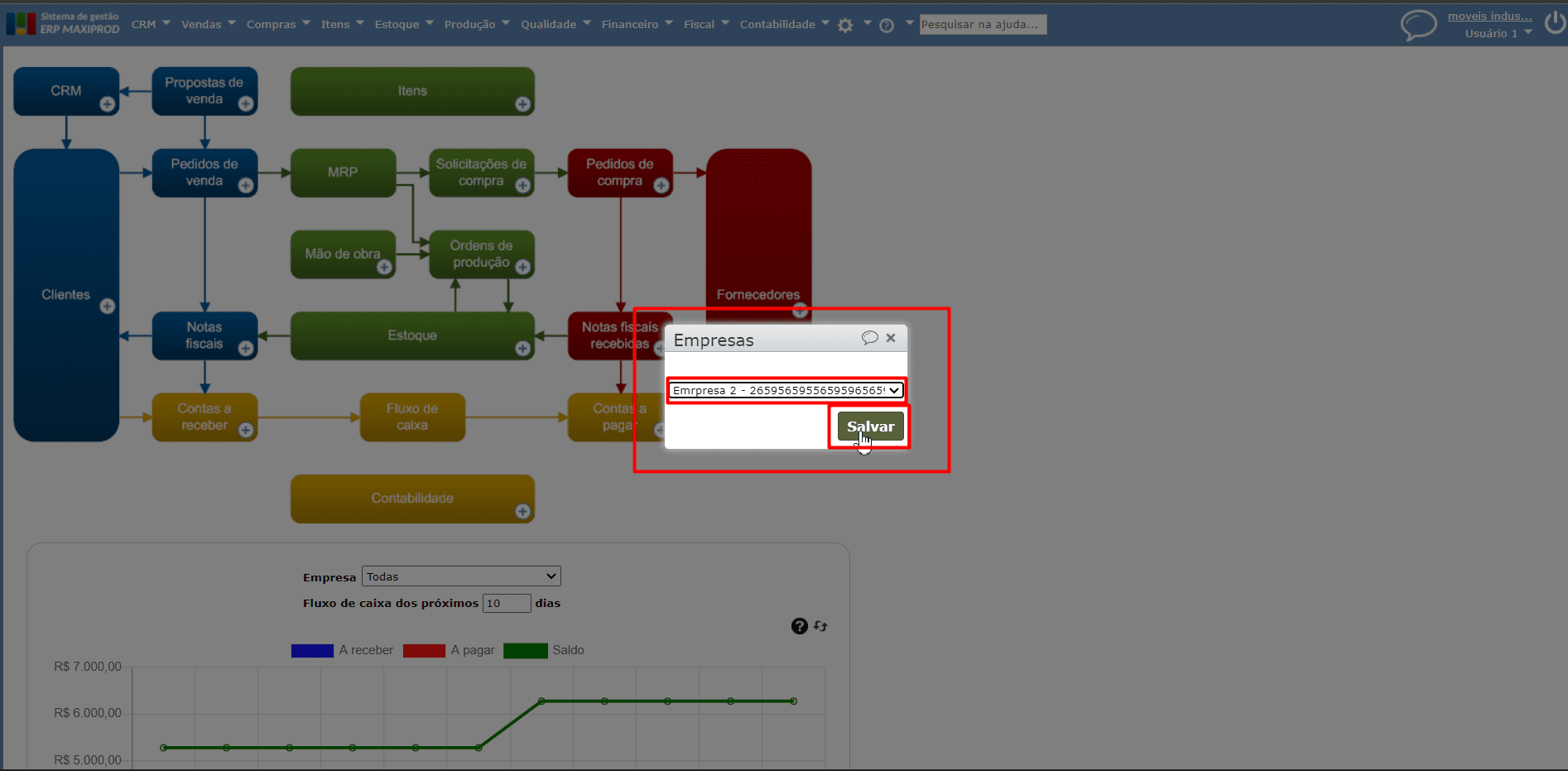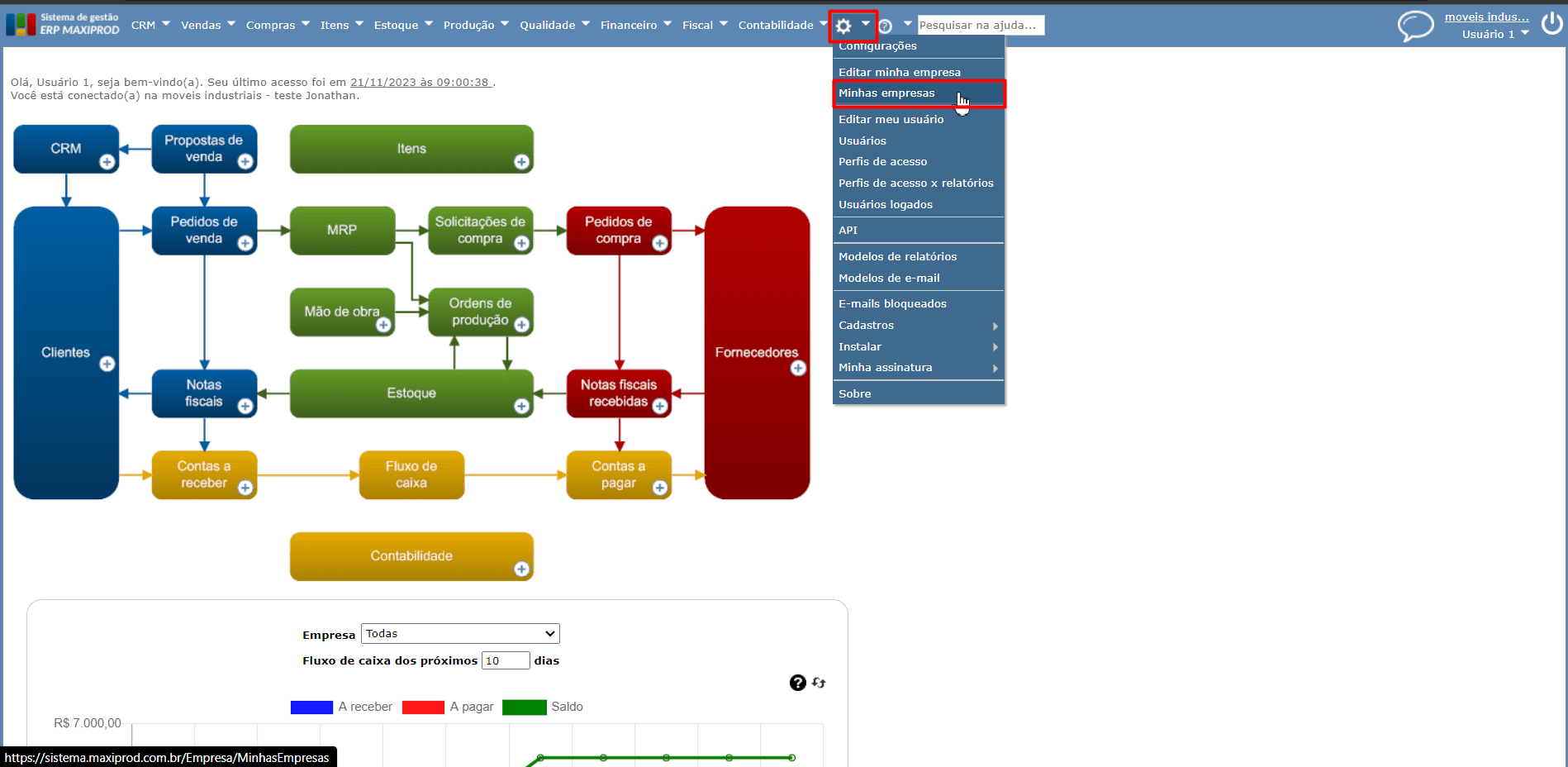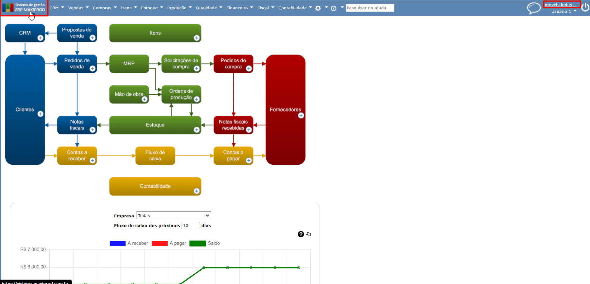 3) A seguir, retorne para a página inicial do sistema clicando em “Sistema de gestão ERP MAXIPROD“. Feito isso, no canto superior direito, o nome da empresa tornou-se um botão clicável.