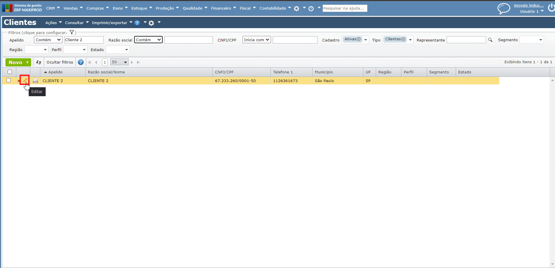 1) Acesse o cadastro da empresa em questão, como, por exemplo, no menu “Vendas > Clientes”.