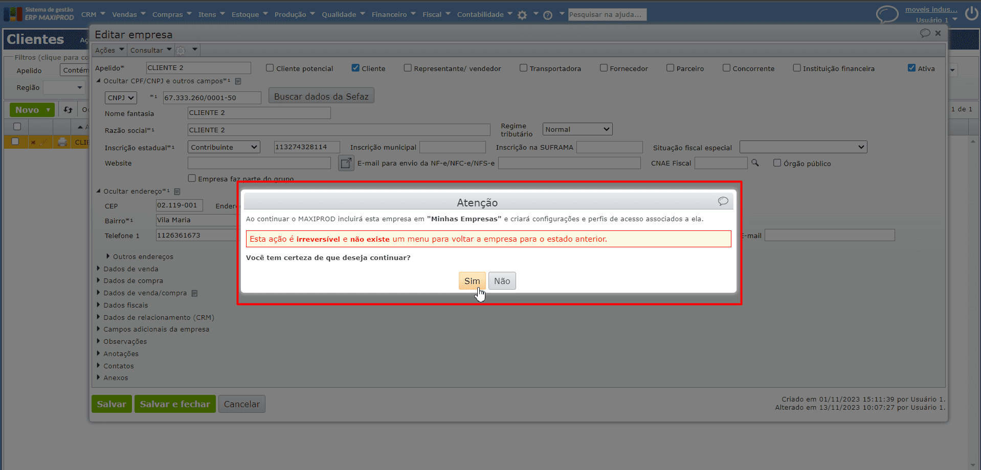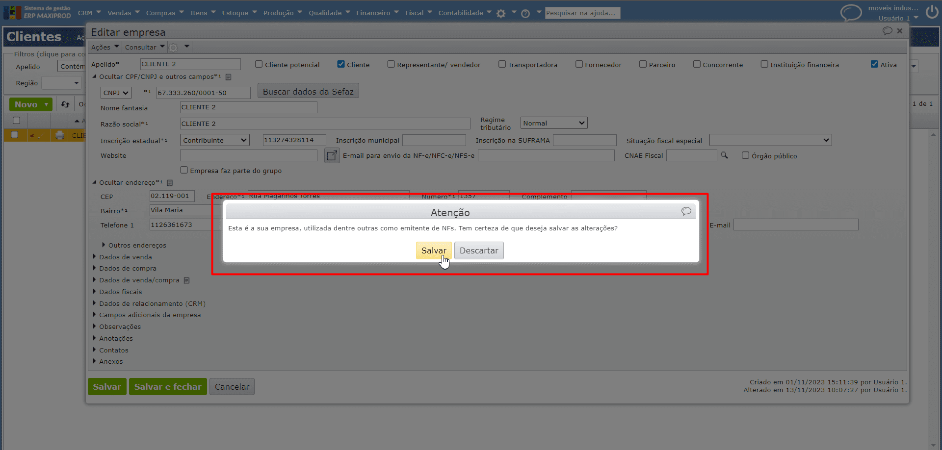Esta é a sua empresa, utilizada dentre outras como emitente de NFs. Tem certeza de que deseja salvar as alterações?