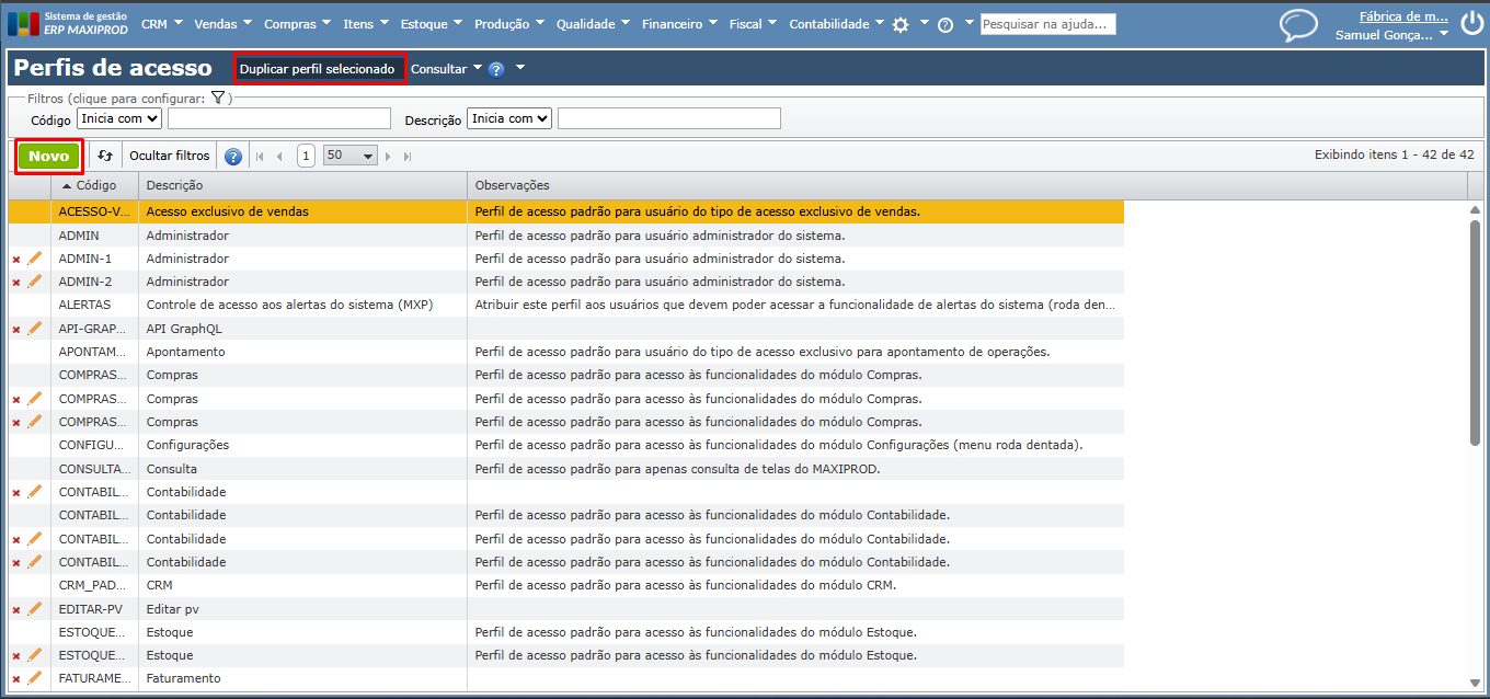 2) Clique no botão verde “Novo” para criar um novo perfil do zero. Também é possível aproveitar um perfil de acesso já existente e fazer as alterações necessárias. Para isso, selecione o perfil de acesso desejado e clique em “Duplicar o perfil selecionado”.