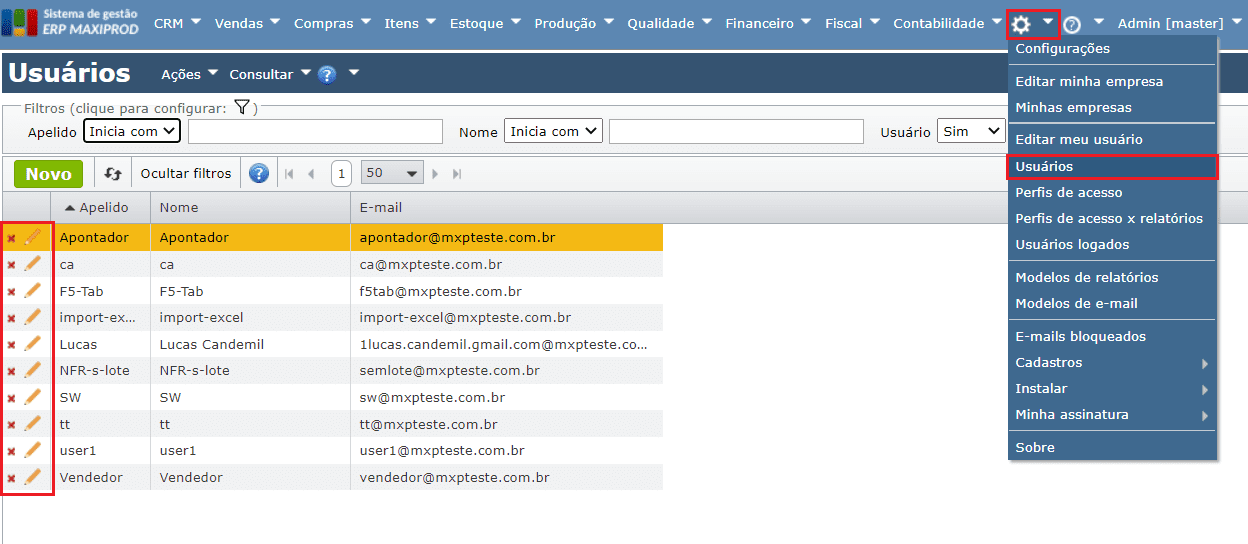 Apenas usuários administradores podem criar novos usuários. Se isso não for possível, por exemplo porque o único usuário administrador saiu da empresa, é necessário criar um novo usuário administrador, fazendo uma solicitação para a Maxiprod, através dos seguintes passos: