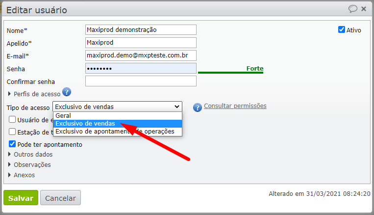 3) Na edição do usuário, na seção “Tipo de acesso”, selecione a opção “Exclusivo de vendas”.