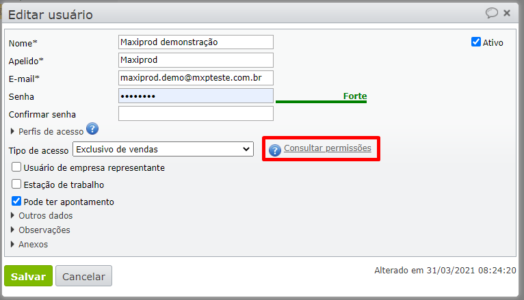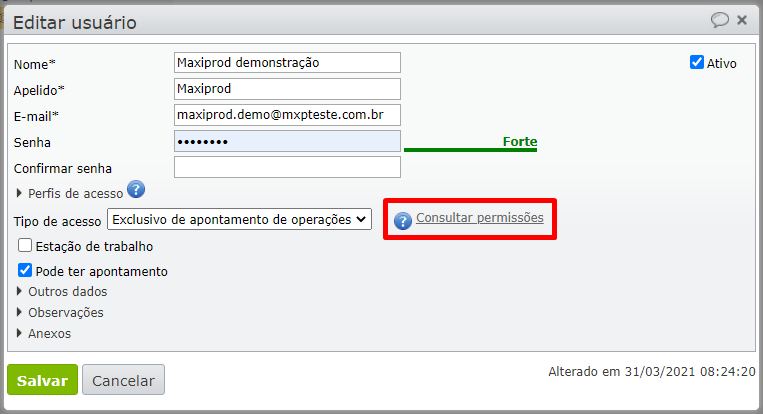 4) Para ver as permissões que podem ser atribuídas a um usuário exclusivo de apontamento de operações, clique em “Consultar permissões”, ao lado das opções de tipo de acesso.