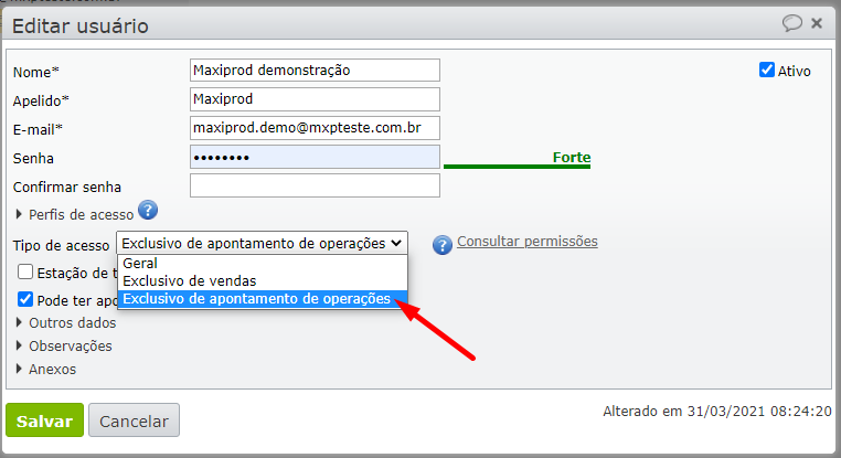 3) Na edição do usuário, seção “Tipo de acesso”, selecione a opção “Exclusivo para apontamento de operações”.